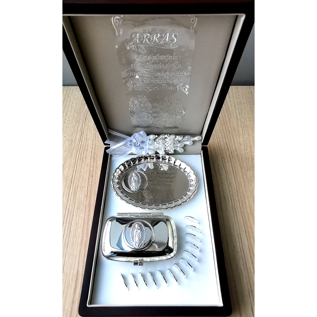 Elegante estuche de madera, en diferentes formas, tamaños y colores que contiene 13 monedas que los novios intercambian en la ceremonia nupcial y simbolizan la prosperidad.
